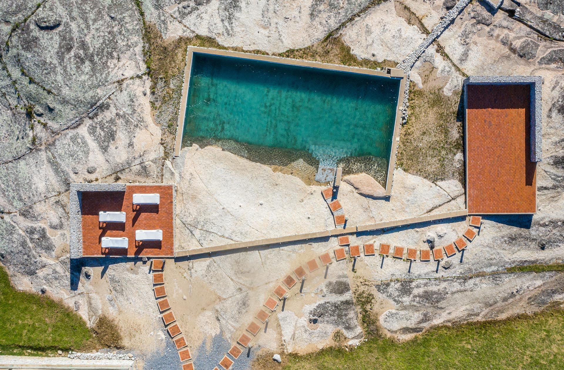 La casa está situada en un campo privado de 107 hectáreas, construida en armonía con las colinas y sobre terrazas naturales.